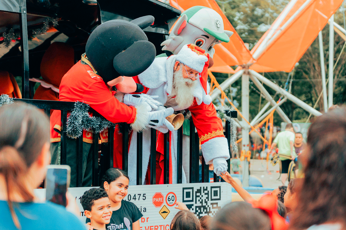 A programação incluiu diversas atrações para o público infantil, como brinquedos infláveis e cama elástica, garantindo a diversão de todos os presentes. As crianças também puderam interagir com o Papai Noel e com personagens icônicos, incluindo Patrulha Canina, Sonic, Mickey, Minnie, Pateta e Mario, que fizeram a alegria dos participantes mirins.